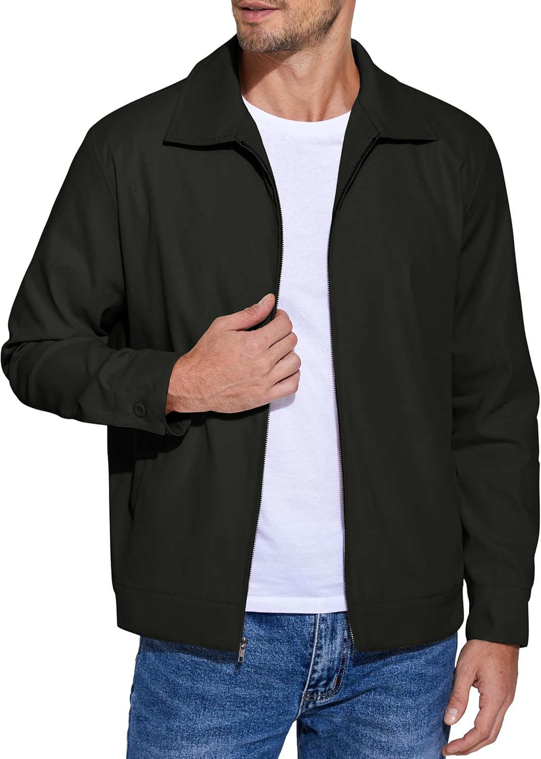 - VERSATILE JACKET — Combine this turndown collar jacket with a tee and your favorite slacks for a casual & easygoing look. The men’s zip front jacket works great with cargo pant, and running shoes for an active & outdoor look. In winter, pair with a sweater, dark jeans for a city-ready outfit, or layering it over a classic button down shirt creates a office & business style.