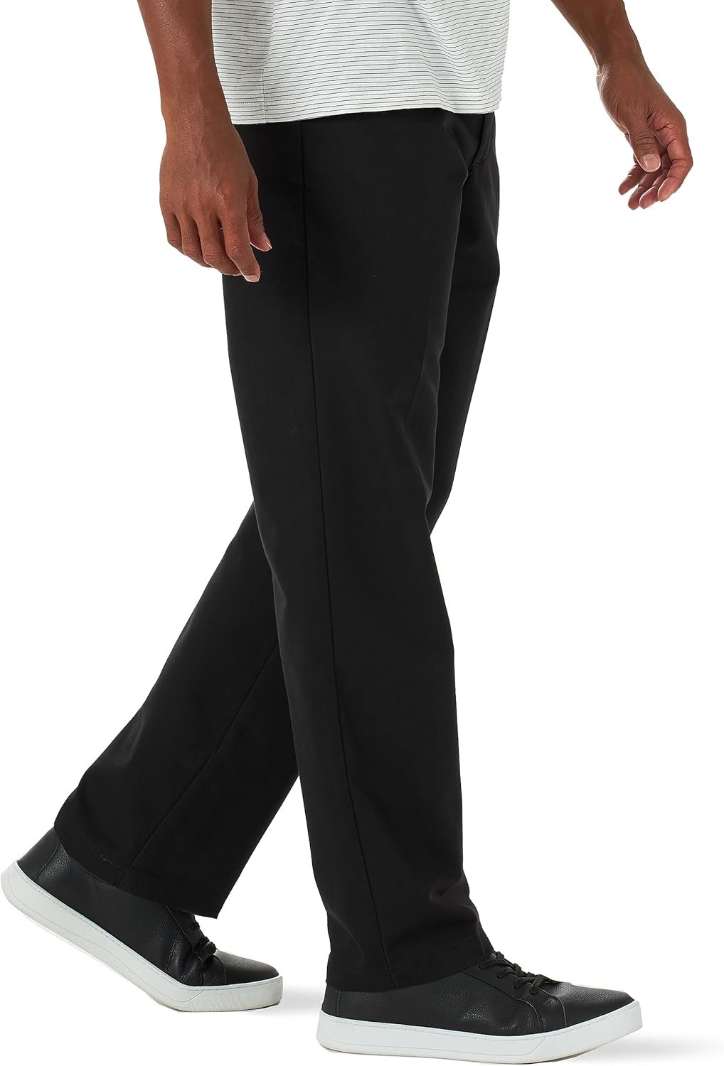 - RELAXED FIT. These mid-rise pants feature a relaxed fit through the seat and thigh with a tapered leg. These flat front pants offer a timeless look perfect for any occasion.