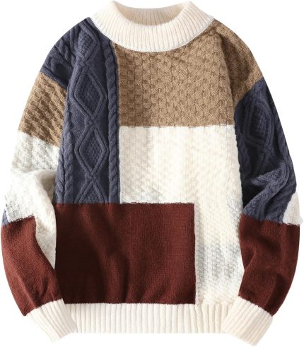 $48Men Patchwork Pullover Sweater Casual Knitted Crewneck Colorblock Thick Knitwear Long Sleeve Winter Warm Jumper Top